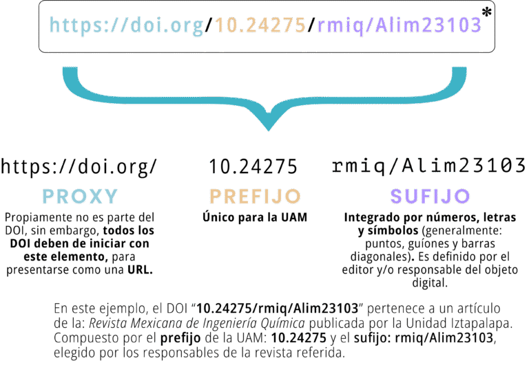 El DOI se integra por una cadena de números, letras y símbolos – prefijo y sufijo. Sirve para identificar de forma única y permanente objetos digitales (artículos de revista, imágenes, audios, libros, etc.) mediante la asignación de una dirección web (URL).